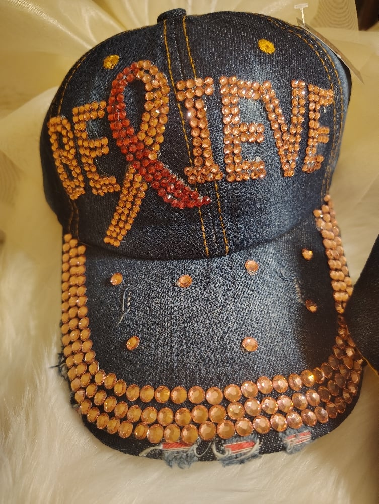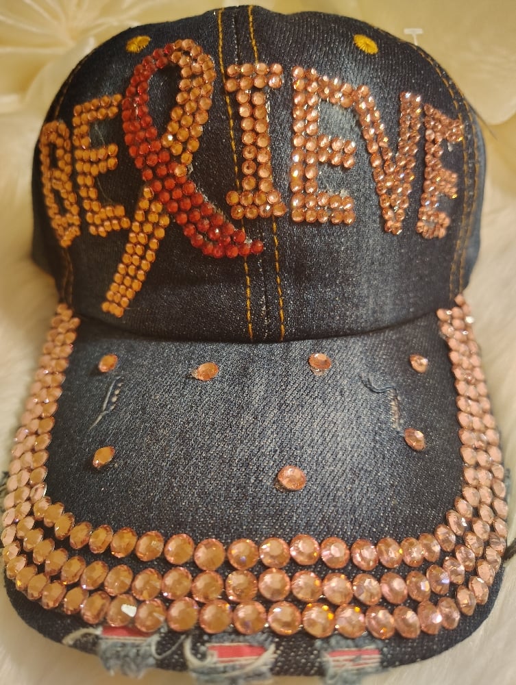 Distressed denim and pink 🩷 stones embellished on the Hope ladies cap.