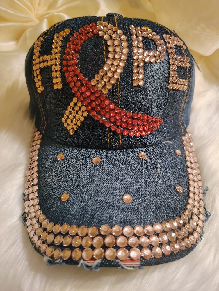 Distressed denim and pink 🩷 stones embellished on the Believe ladies cap.