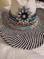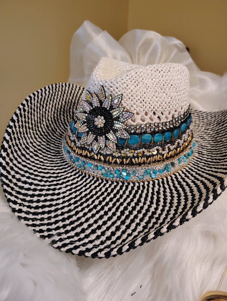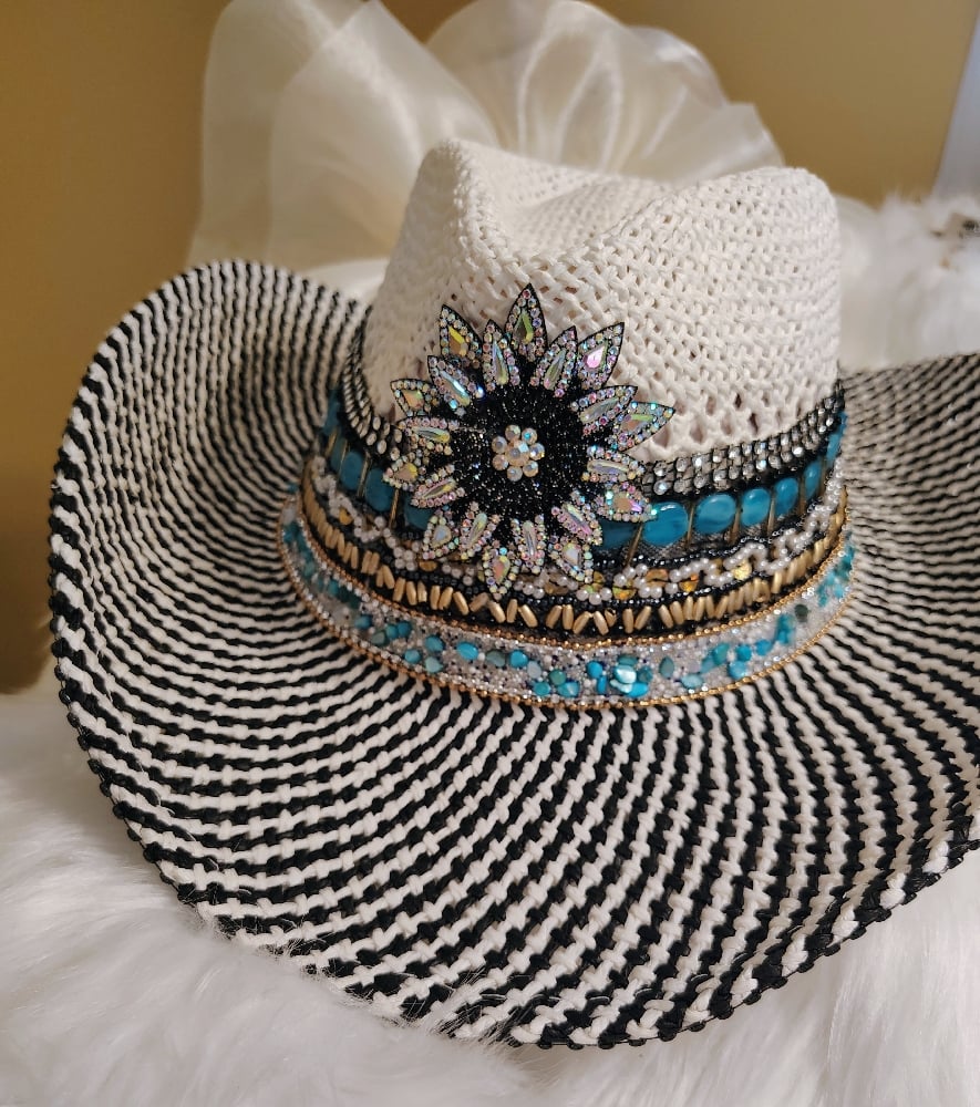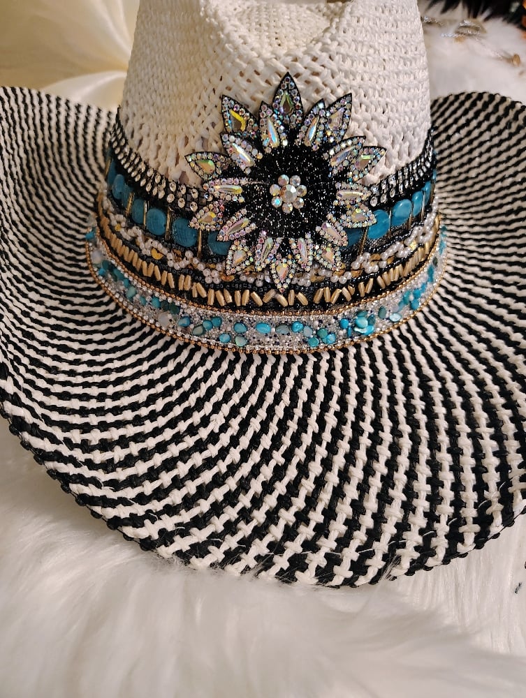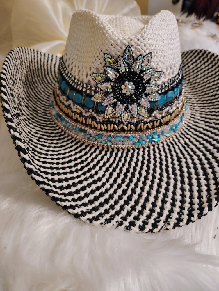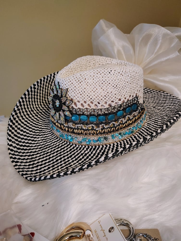 Western Collection: White and black Western style hat featuring a black and white peppered pattern with polished turquoise stones, hammered gold beads and shimmering crystals that scatter light like desert stars at night. This hat is regal opulence with a Western spirit!